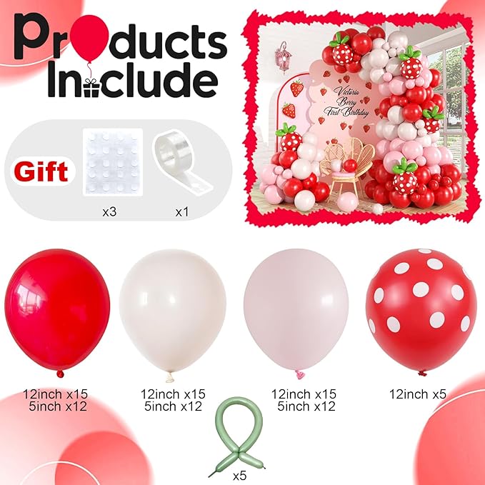 - Strawberry Party Balloons Set: The strawberry first birthday decorations have 95pcs helium balloons, include 12" 5pcs red and white print balloons, light pastel pink balloons (12"15pcs+5"12pcs), white balloons (12"15pcs+5"12pcs), red balloons (12"15pcs+5"12pcs), green long balloons 5pcs, 16ft balloon strip tape (1 roll), 60pcs glue dot.