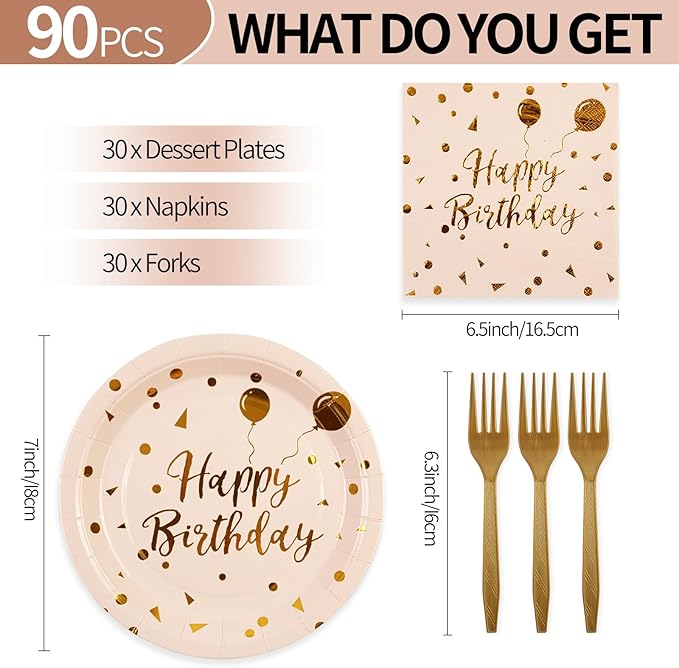 90PCS Happy Birthday Plates and Napkins Party Supplies, Disposable Pink Gold Dot Dessert Paper Plates Napkins with Forks Tableware Set Party Decorations for Girl Women Birthday Parties