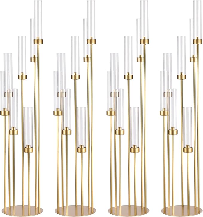 - About Product Size: Package:4 Packs Floor Candle Holders Tall Set. Material: Metal. Color: Gold Style: 7-Arm and Thick Round Base Overall Height: 48" Arms Heights: 24.6", 28.5", 32.4", 36.2", 40.2", 44", 48",Base Size: 9.36"Dia. Candle Cups Size:0.98” Dia. Note: Candles and other accessories are not included!Due to different light settings the actual color might vary a bit from the pictures.The 4 piece floor candle holders tall set can meet the decoration needs of weddings, restaurants, parties and various scenes