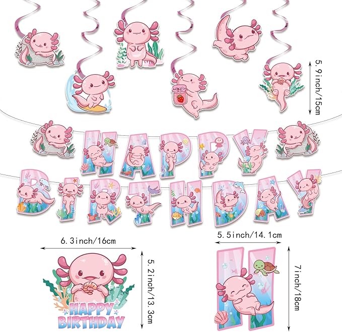164PCS Pink Cartoon Axolotl Birthday Party Decorations, Tableware Axolotl Party Supplies Plates and Napkins Set, Banner, Hanging Swirls, Tablecloth, Cake Cupcake Topper, Reptile Animals Baby Shower