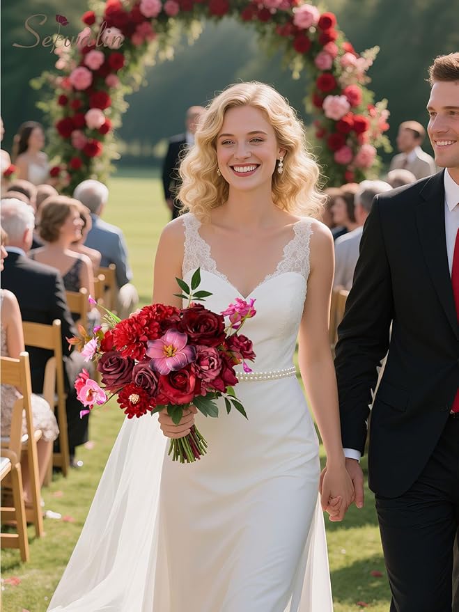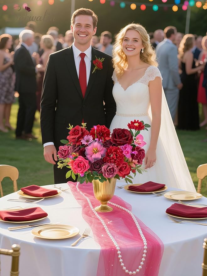 Serwalin Artificial Burgundy & Fuchsia Flowers, Silk Fake Flowers Stems for Wedding Bouquets DIY, Baby Shower Centerpieces, Cake Decor, Birthday Party & Home Decor