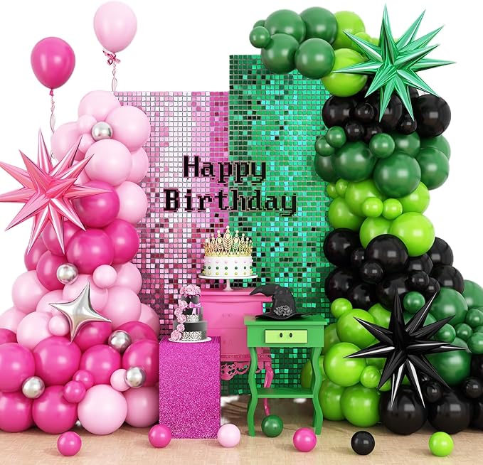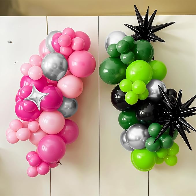- 【Pink Green Black Balloon Garland Arch Kit 】 -This 155pcs set includes everything you need for a whimsical Witch-themed celebration: 146pcs balloons(black/dark green/fruit green/hot pink/pastel pink/silver), 3pcs explosion star black/green/pink, 1pcs silver four-pointed, balloon tools(balloon arch strips, glue points, ribbon). Perfect for creating an enchanting atmosphere inspired by witches and princesses.