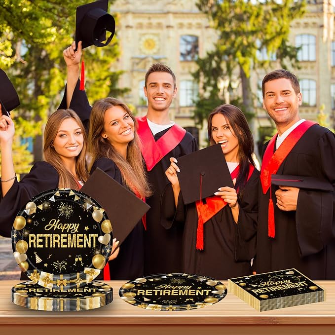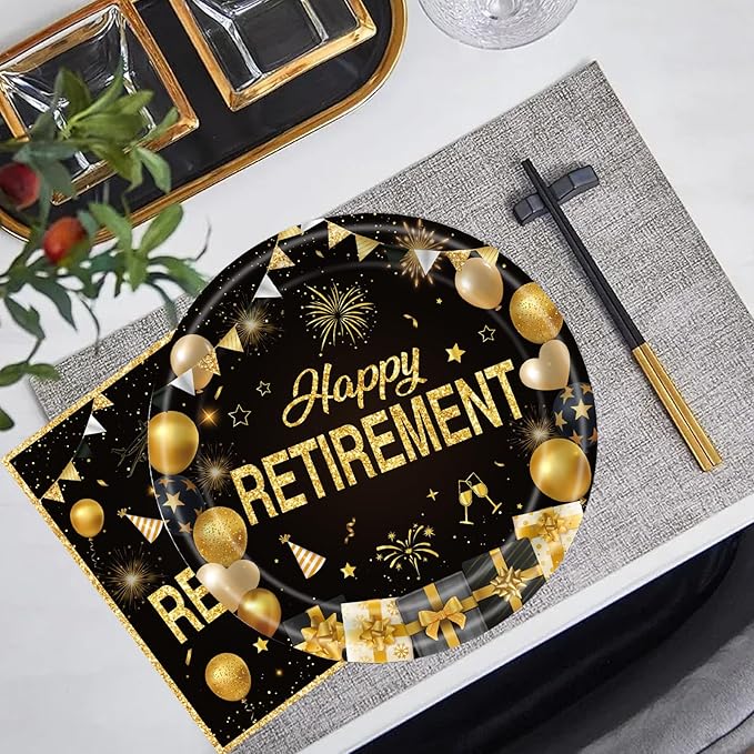 - 【Elegant Retirement Design】 Featuring a sophisticated black-and-gold color scheme and cheerful retirement-themed patterns, these plates and napkins add a touch of elegance to your party decor, creating a memorable celebration for the guest of honor.