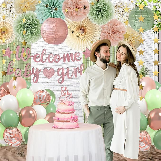 - Green And Pink Baby Shower Decorations Kit: Everything you need in one box! Includes a "Welcome Baby Girl" banner,matte green foil curtains, dusty rose pink, sage green paper pom poms flowers fan lanterns, avocado rosegold balloons, a “OH BABY” cake topper, and star garland perfect for walls, tables, and ceiling decor. No hassle, just party-ready perfection