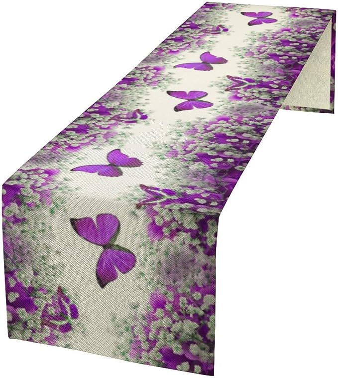 Floral Butterfly Spring Table Runner, Purple Flowers Seasonal Kitchen Dining Table Decoration for Home Party Decor 13x60 Inch