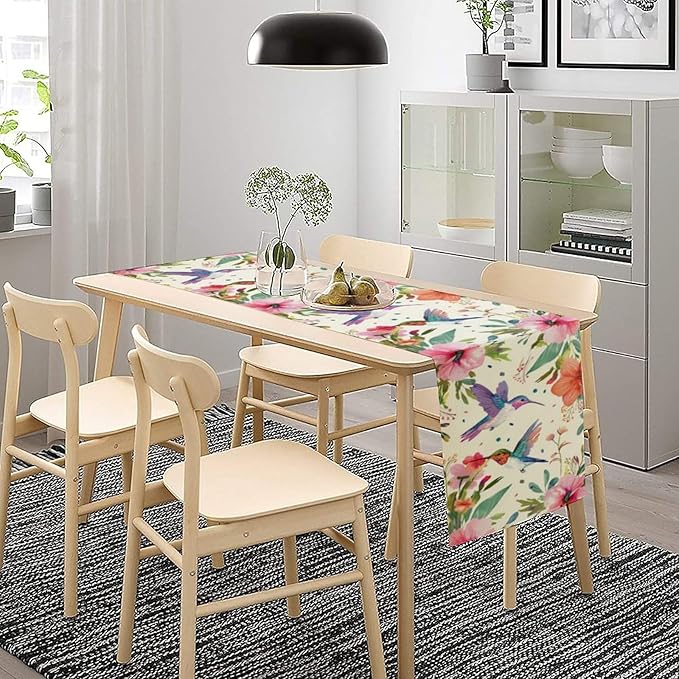 Flowers Birds Spring Table Runner, Colorful Birds Branches Blue Floral Seasonal Kitchen Dining Table Decoration for Home Party Decor 13x60 in