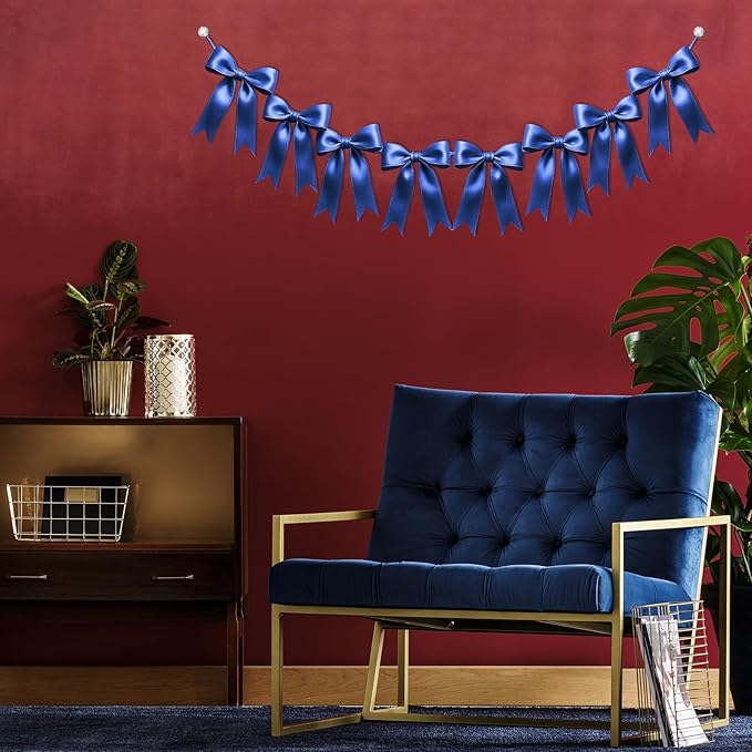 1 String of 8PCS Navy Blue Bow Garland Banner Decoration,Pre-Strung Satin Ribbon Ornaments for Birthday,Bachelorette Party,Bridal Shower,Wedding,Engagement,Baby Shower,Graduation Decor,Anniversary