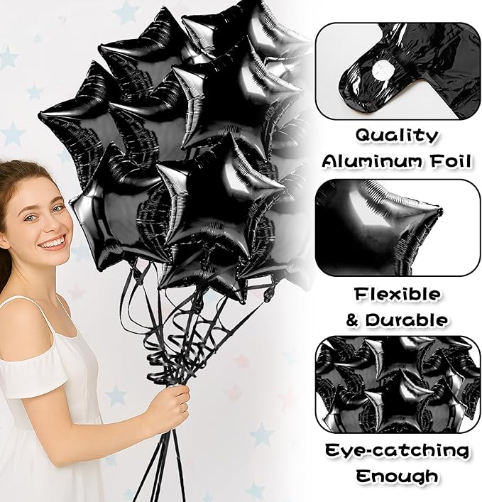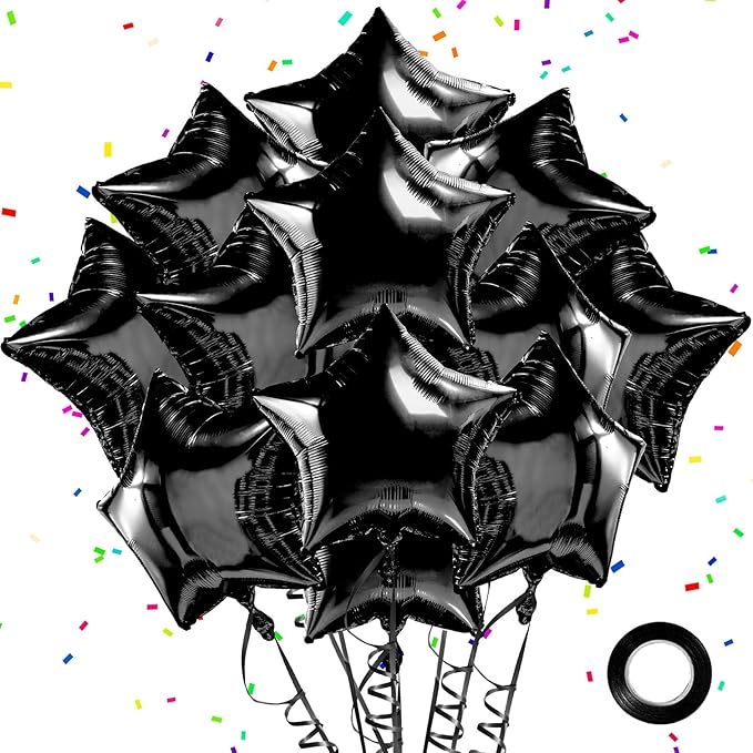 - PACKAGE INCLUDES: Package includes 12PCS 18 inch black balloons mylar balloons, a roll of graduation balloons and a straw. The black happy birthday balloons is used to tie the black birthday decorations and the straw can inflate the star balloons, the inflated opening is flattened after inflation and automatically seals without leaking, making it a convenient choice for graduation balloon. Our foil balloons metallic balloons are eye-catching enough to make your party decorations stand out.