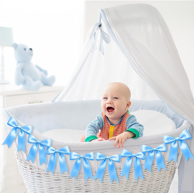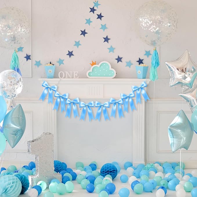 1 String of 8PCS Blue Bow Garland Banner Decoration,Pre-Strung Satin Ribbon Ornaments for Birthday,Bachelorette Party,Bridal Shower,Wedding,Engagement,Baby Shower,Graduation Decor,Anniversary