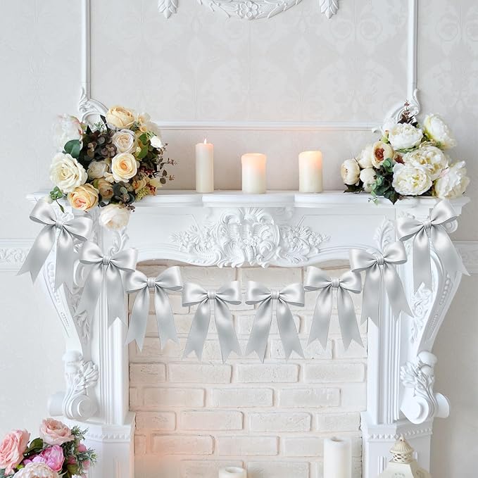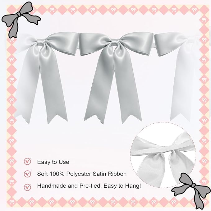 1 String of 8PCS Silver Bow Garland Banner Decoration,Pre-Strung Satin Ribbon Ornaments for Birthday,Bachelorette Party,Bridal Shower,Wedding,Engagement,Baby Shower,Graduation Decor,Anniversary