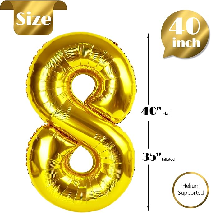 Gold Number 8 Balloon 40 Inch, 8th Birthday Party Decorations for Children, Giant 8 Foil Balloon for Party Supplies