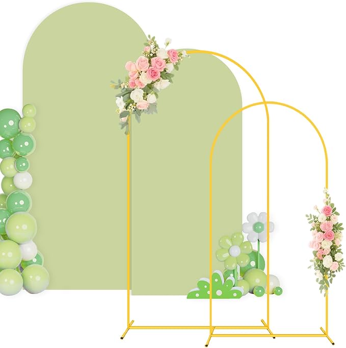 - đ„ăPackage Information - Metal Arch Backdrop Stand and Cover SetăArch stand and cover set includes 2 size gold metal arch backdrop stand, 7.2FT(H)x4FT(W) and 6FT(H)x2.6FT(W), and the same size sage green arch cover. The backdrop arch with cover gracefully and adds a romantic atmosphere to your event.