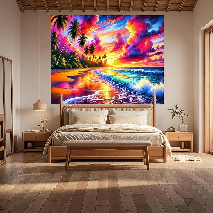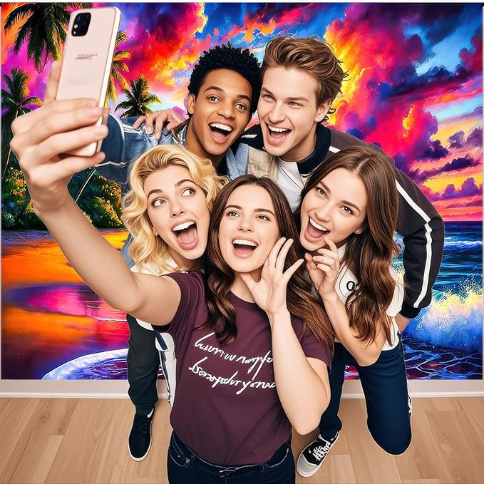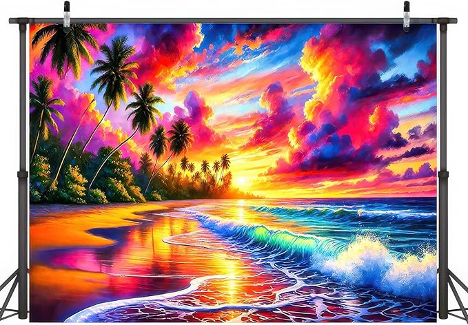 - Vibrant Coastal View: This tropical sunset backdrop shows vivid skies and glowing waves. The beach banner, ocean photography background, palm tree wall decor, and summer party backdrop create a relaxing coastal feel.