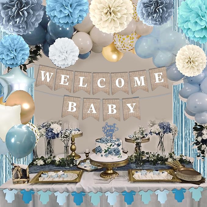 - Complete Baby Shower Decor: Our kit includes everything you need for a stunning party setup: a "Welcome Baby" banner, 8PCS tissue pom poms, a baby clothes banner, a "Sweet Baby Boy" cake topper, blue fringe curtains and 50PCS dusty blue balloons. This all-in-one set makes it easy to transform your space