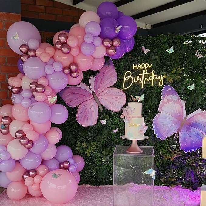 - Metallic Hot Pink and Purple Balloons Set: This Metallic Purple Pink Balloons and Pastel Purple Pink kit includes 60 high-quality 12-inch balloons in seven colors: chrome purple latex balloons, chrome pink latex balloons, magenta latex balloons, pink confetti latex balloons, purple confetti latex balloons, macaron pink latex balloons and macaron purple latex balloons, plus a purple ribbon. It’s perfect for decorating butterfly theme parties, adding a vibrant touch to any celebration