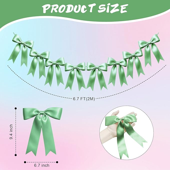 - Pre-strung&No DIY Required: Eonsui bow garlands are fully assembled, with 8 beautifully crafted bows already attached to a string, so there’s no need for extra assembly on your part, saving your time when decorating. Each garland measures 6.7 feet (2 meters) in length and includes 8 bows, each bow measuring 9.4 inches by 6.7 inches, making it suitable for decorating walls, windows, tables, beds, etc.