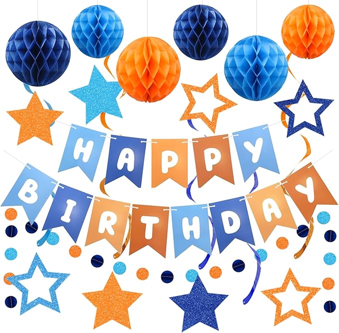 Pre-Strung Happy Birthday Decorations for Boys Men Women, Orange Blue Birthday Banner with Honeycomb Balls, Stars Hanging Swirl Streamers, Circle Dots Garland