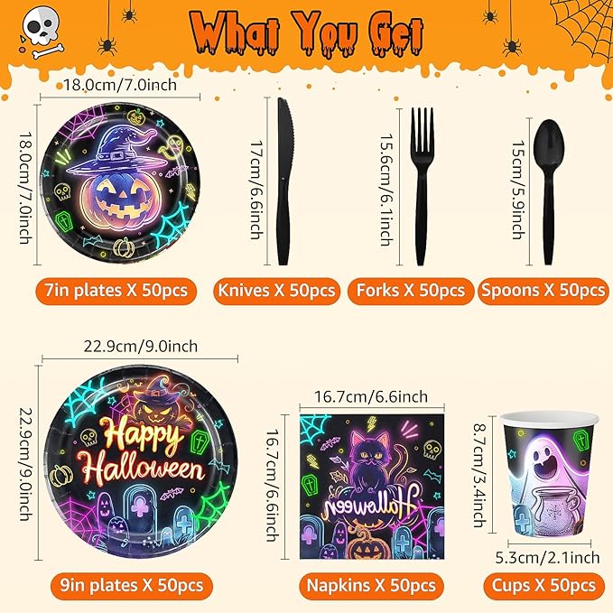 - Included Components : 50 9-inch paper halloween plates, 50 7-inch paper dessert plates, 50 paper cups, 50 spoons, 50 forks, 50 pocket knives and 50 special Halloween napkins 50 9-inch paper halloween plates, 50 7-inch paper dessert plates, 50 paper cups, 50 spoons, 50 forks, 50 pocket knives an… See more