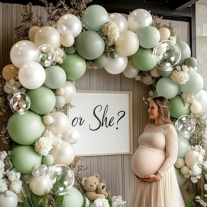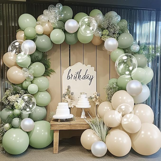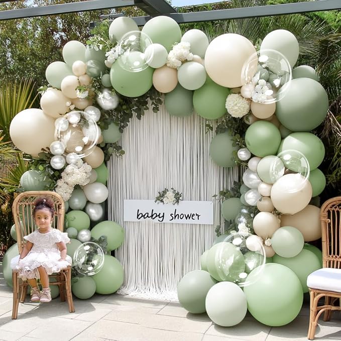 - THE FUN OF DIY- The light green white balloons to meet your party needs.Double layer olive green balloons,dusty green balloons,white sand balloons and pearl white balloons make up this baby shower balloon arch; We add dusty green balloons to green balloon arch kit for more retro tones; DIY a gorgeous green double stuffed green balloon garland to wow your guests has never been easier with this dusty green beige balloons kit.