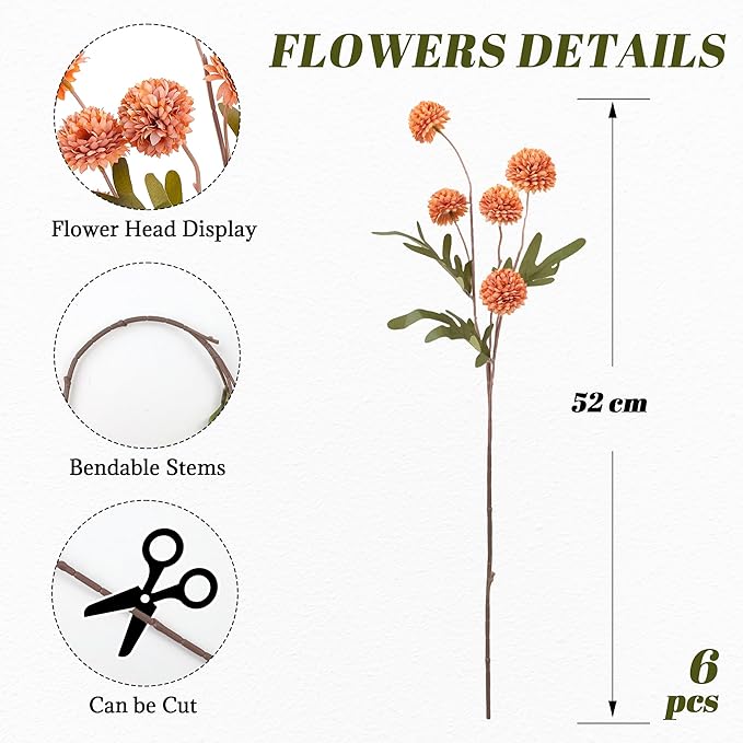 - Small Flower Balls Size: The chrysanthemum flowers artificial is 52 cm/20.5 inches in length. The flower stem is made of plastic wrapped around iron wire, which is flexible and can be cut, and is suitable for various heights of vases