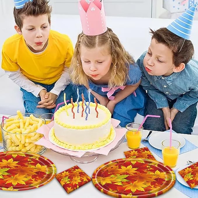 - Get a perfectly coordinated table without the stress! Everything in these fall birthday decorations – from the plates to the napkins – features the same lovely maple leaf pattern. It all works together beautifully, so you can create an elegant, put-together look in no time flat.