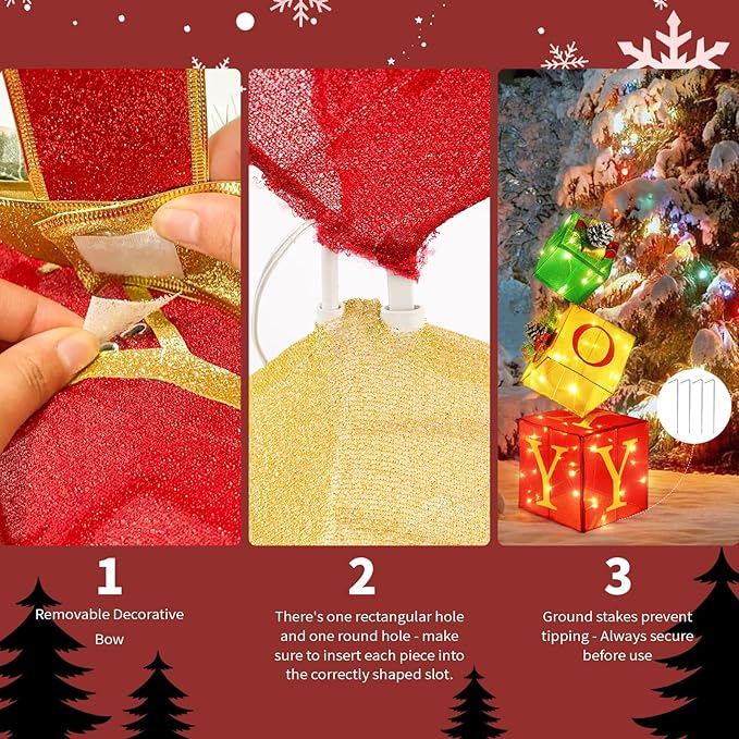 - Easy to Assemble: The lighted gift boxes can be stacked up to 2.8Ft tall. Each box has a hidden round hole and rectangular slot—just match the shapes to stack them securely. (Note: The slots are discreetly designed, so check carefully!)
