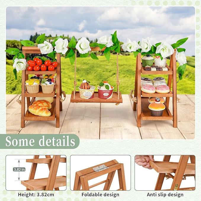 - Interesting Design: Our wooden cupcake stand consists of two ladders and a swing, it is very delicate and cute, suitable for all kinds of party events, perfect for holding desserts and decorating your home.