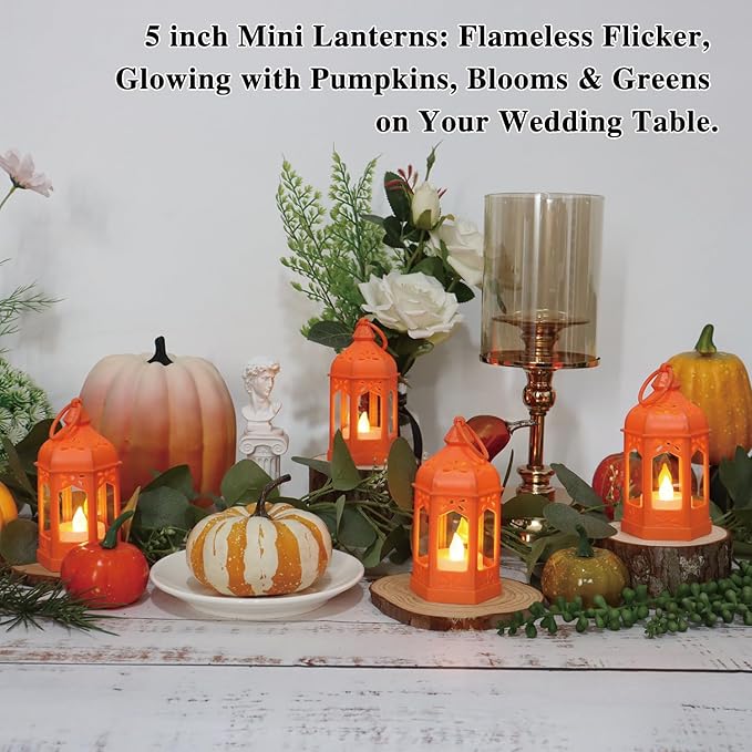 8 Pcs Mini Lantern with Flickering LED Candles, LLQ Orange Vintage Decorative Hanging Candle Lanterns for Halloween, Christmas, Wedding Decorations, Party, Table Centerpiece, Battery Included