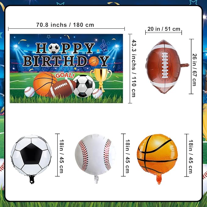 - Versatile Birthday Vignettes: Complete your sports-themed setup with our wide array of decorative accents, including balloons, a banner, honeycomb table centerpieces, and a sports backdrop. Instantly transform any space into an energetic birthday celebration with our sports party supplies. Effortlessly incorporate this must-have set into your party décor and bring every corner of your celebration to life. No matter the sport, these decorations deliver fun and team spirit