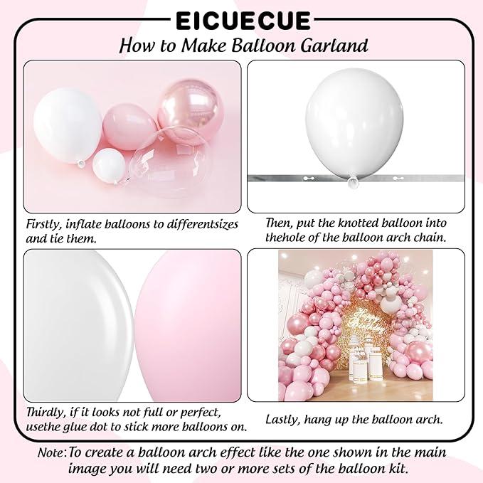 - Create Unforgettable Celebrations: Elevate your special moments with the EICUECUE pink and white balloon arch kit. This comprehensive kit includes 154 premium balloons and essential accessories. It included are three 18" clear balloons, along with an array of pink (2pcs 18", 10pcs 12", 25pcs 10", 30pcs 5") , white (2pcs 18", 5pcs 12", 15pcs 10", 20pcs 5") and pink double stuffed balloons(2pcs 18", 5pcs 12", 15pcs 10", 20pcs 5") balloons. You’ll also receive a balloon garland strip and dot glue for effortless assembly