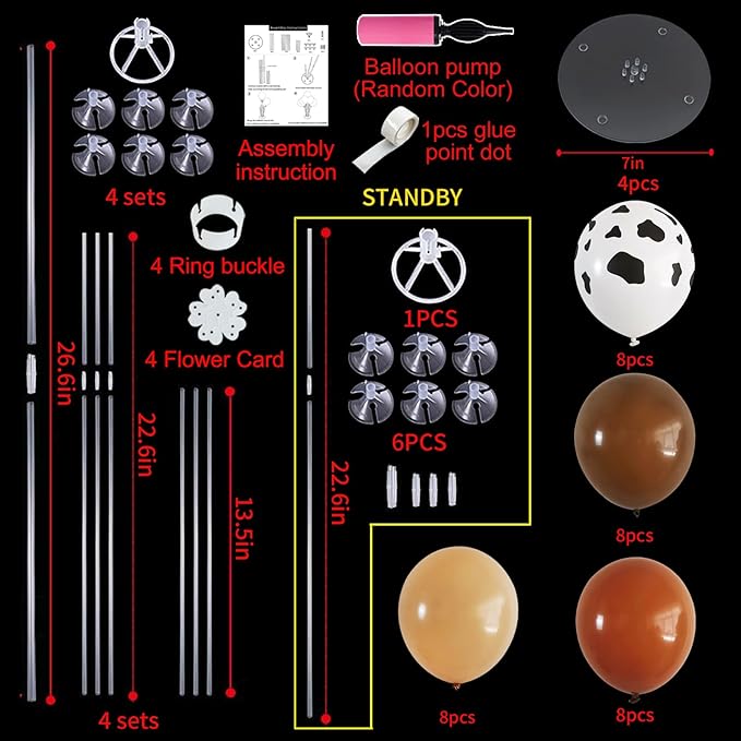 - Package Includes: The balloon arch kit includes 4 reusable balloon stands and 12 inch 32 pcs balloons(8 Apricot balloons,8 brown balloons,8 cocoa brown balloons and 8 cow print balloons),glue point dots,balloon pump,balloon clips,and tie tool.You don’t need to waste money to buy balloons