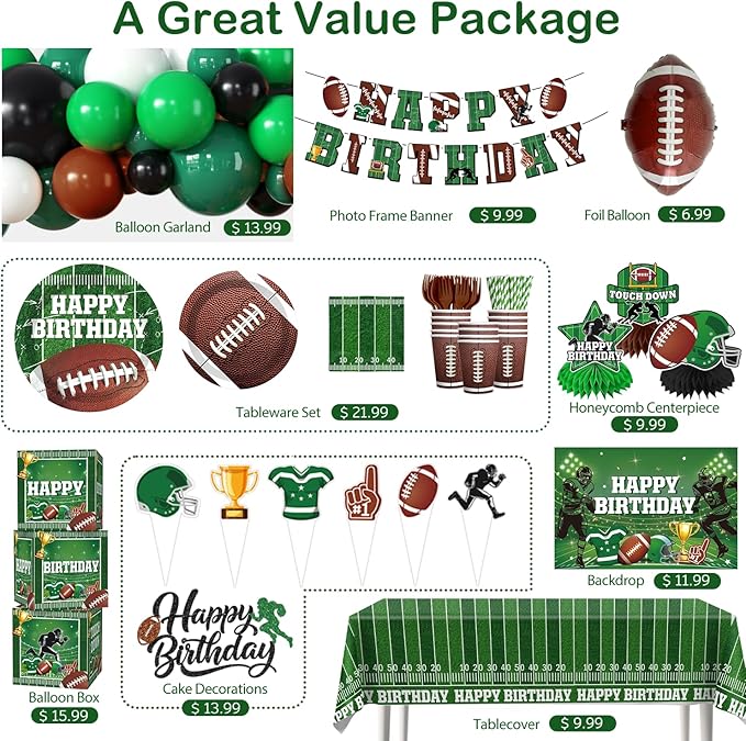 - one-stop football party decorations: our football birthday party decorations are designed to celebrate game day party, football season party, or sports theme birthday for kids or adults. the set includes 1 "football happy birthday banner" , 1 football backdrop for birthday party, 3 balloon boxes, 1 football cake topper, 12 football cupcake topper, 2 pcs foil balloons, 20-pack: 7-inch and 9-inch plate, napkin, paper cup, fork, straw, 2 tablecloths and 100 balloons, ensuring your football themed party is flawless