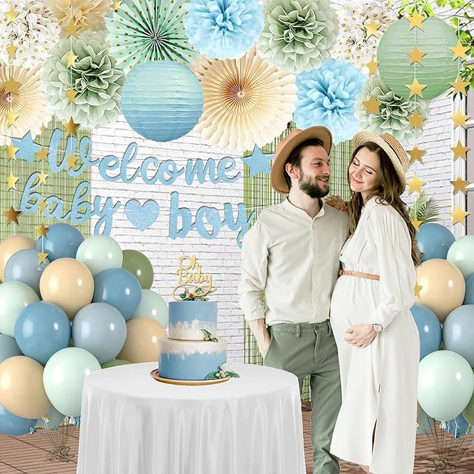 - Green And Blue Baby Shower Decorations Kit: Everything you need in one box! Includes a "Welcome Baby Boy" banner,matte green foil curtains, dusty blue, sage green paper pom poms flowers fan lanterns, avocado green & sea blue retro balloons, a “OH BABY” cake topper, and star garland perfect for walls, tables, and ceiling decor. No hassle, just party-ready perfection