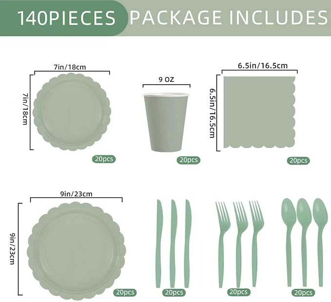 - 140 Pcs Sage Green Party Supplies Set Serve 20 Guests : Includes 20 x 9 inch sage green paper plates, 20 x 7 inch sage green dessert plates, 20 x 9 ounce paper cups, 20 x 6.5 inch sage green paper napkins, 20 plastic forks, 20 knives, and 20 tablespoons nice combination can support your use needs