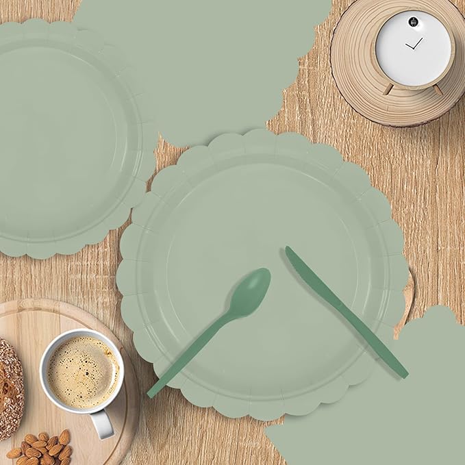 140Pcs Sage Green Paper Plates and Napkins, Sage Green Party Supplies Include Green Scalloped Plate Paper Napkin Cup Plastic Cutlery for Baby Shower, Wedding, Birthday