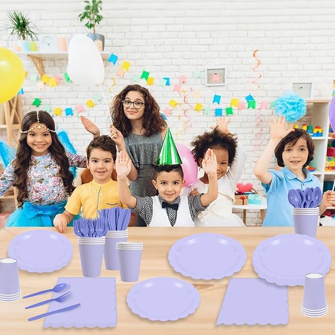 - 140 Pcs Gentle Light Purple Party Supplies Set Serve 20 Guests : Includes 20 x 9 inch gentle light purple paper plates, 20 x 7 inch gentle light purple dessert plates, 20 x 9 ounce paper cups, 20 x 6.5 inch gentle light purple paper napkins, 20 plastic forks, 20 knives, and 20 tablespoons. A nice combination can support your use needs.