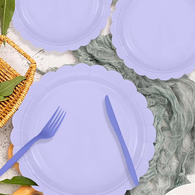 140 Pcs Lavender Paper Plates and Napkins, Light Purple Party Supplies Include Scalloped Lavender Plates Napkin Cup Plastic Cutlery for Garden Party, Baby Shower, Wedding, Birthday