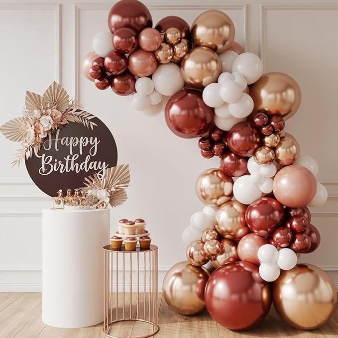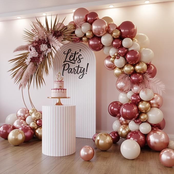 - Saxuxu Burgundy Red Decorations: The rose gold and white balloons include metallic rose gold balloons (12 inch*8); pearl rose gold balloons (12 inch*12); sand white balloons (12 inch*12); retro burgundy red balloons (12 inch*12); confetti rose gold balloons (12 inch*6); ribbons (10 m*2).