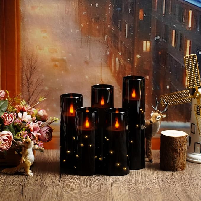 Flameless LED Candles with Timer 5 Pc Flickering Flameless Candles for Romantic Ambiance and Home Decoration Stable Acrylic Shell,with Embedded Star String,Battery Operated Candles(Black)