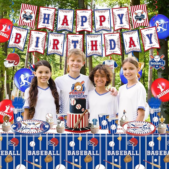 161PCS Baseball Birthday Party Decorations, Baseball Party Supplies Plates and Napkins Set, Tableware,Banner, Hanging Swirls, Tablecloth, Cake Cupcake Topper, Ballons