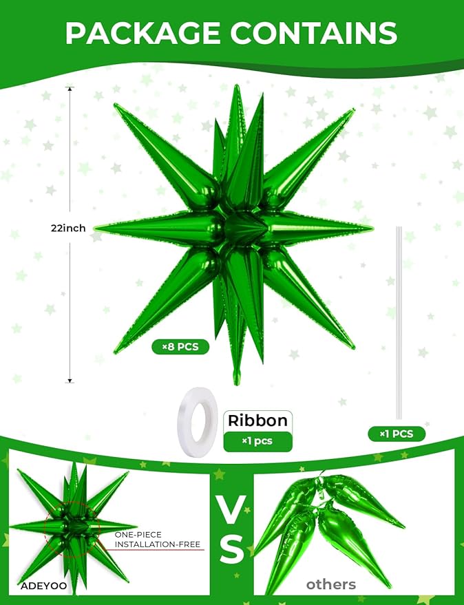 - Green Star Balloons: You will receive 8 vibrant green mylar balloons, along with a roll of white ribbon and a straw for easy inflation. These star balloons can be placed anywhere to add a bright, eye-catching touch to your party decorations.