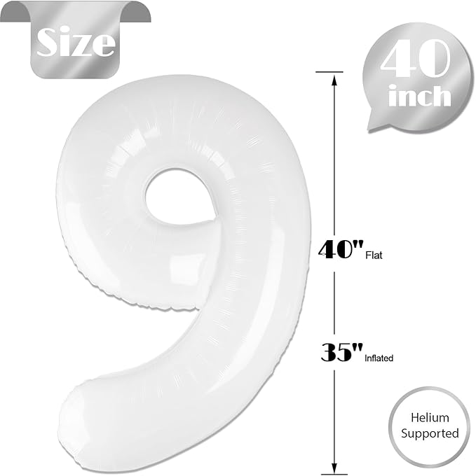 White Number 9 Balloon 40 Inch, 9th Birthday Party Decorations for Children, Giant 9 Foil Balloon for Party Supplies