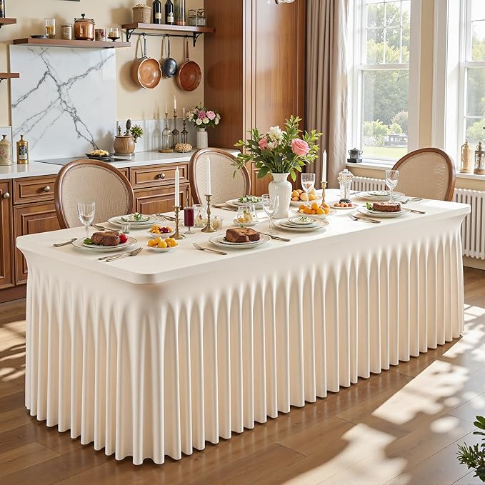 - 【Unique Design Spandex Table Cloth】 - 2-in-1 spandex table cloth - A fitted table cover and table skirt combined in a single piece. Its unique fitted design ensures a perfect fit for desk and tables, while simultaneously functioning as an elegant table skirt to enhance the overall appearance of your banquet or event table. Our table covers for 8 foot tables is specifically designed to save your time and simplify the decoration process, making banquette table decoration look elegant and neat.
