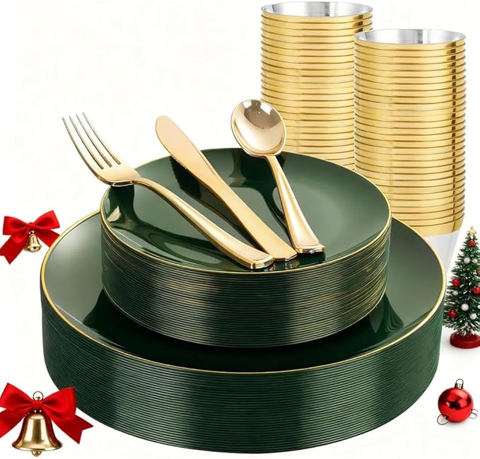 WDF 150Pcs Green Plastic Plates - Green Plates Disposable with Gold Rim - 25Guest Disposable Dinnerware Include 50 Christmas Plastic Plate, 75 Gold Cutlery & 25 9oz Cups for Christmas & Parties