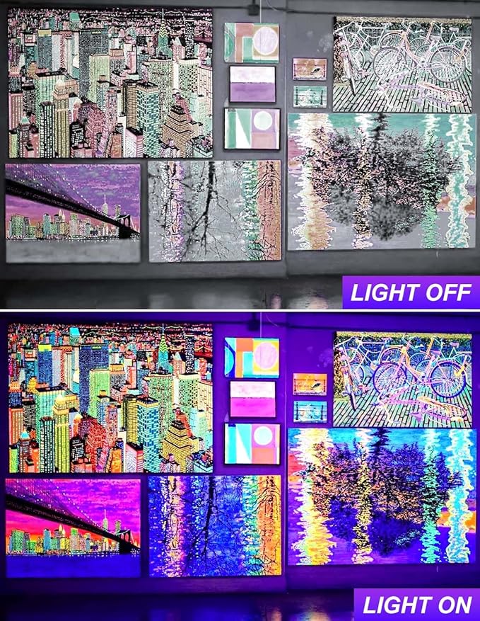 - Fluorescent Reflection: Black light spotlights are suitable for illuminating most reactive pigments, paints and dyes. Black light is especially suitable for neon colored objects, great for visible fluorescent materials. LED black lights are widely used for Halloween, Christmas, glow party, club, bar, yoga and holiday decoration