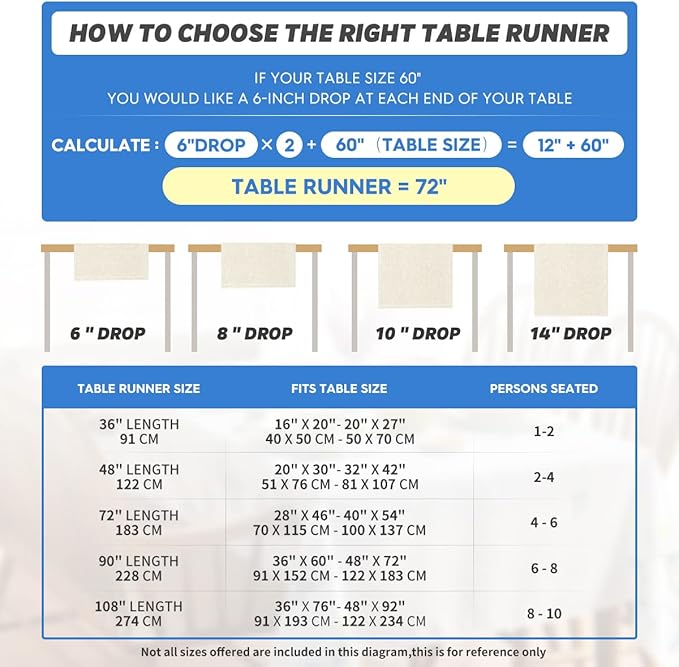 - Fits Table Size : This table runner is 12 x 36 inch, appropriate for a table that can seat 1-2 people, better match your table and give you a delightful dining experience