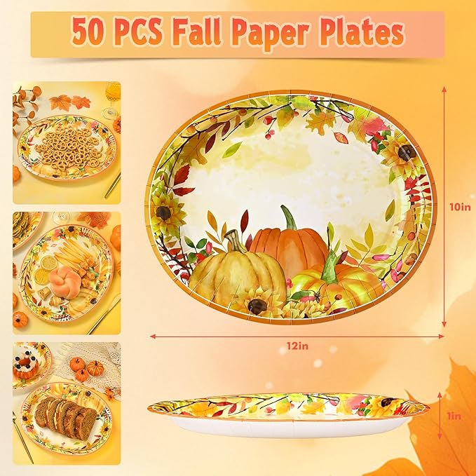 Homlouue 12x10 Oval Fall Paper Plates, 50PCS Fall Leaves Pumpkins Plate, Heavy Duty Thanksgiving Plates, Large Thanksgiving Paper Plate Disposable for Autumn Theme Party Decoration Serve 50 Guests
