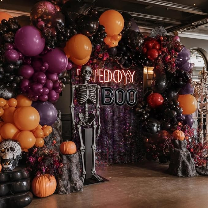 - Halloween Balloon Garland- We used double stuffed burgundy balloons make the orange black purple balloon arch look fuller. Whether you're hosting a Halloween costume party, Halloween party decorations, Halloween birthday party supplies, trick or treat party supplies, spooky ghost theme parties, and haunted house decorations, or simply want to add a touch of Halloween spirit to your home, this black purple orange balloons set is a versatile choice. Hang it on walls, across doorways, or as a stunning table centerpiece.