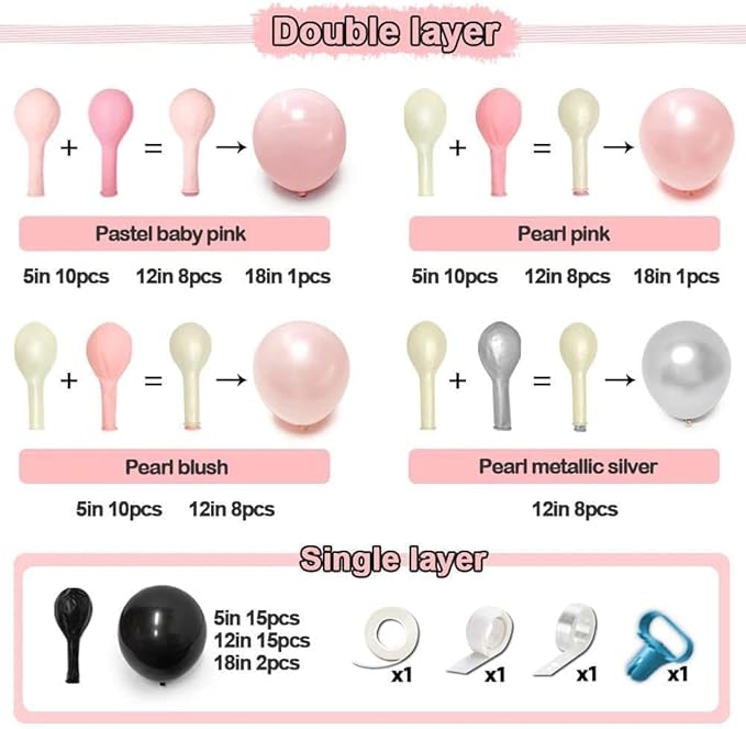 - PEARL PINK BLACK BALLOON ARCH - double pearl pink balloons(5"10pcs+12"8pcs+18"1pcs),double pearl blush balloons(5''10pcs+12"8pcs),double pastel baby pink balloons(5''10pcs+12"8pcs+18"1pcs),double pearl silver balloons(12"8pcs),matte black balloons(5"15pcs+12"15pcs+18"2pcs),clear bobo balloons(10"4pcs),1 roll of balloon strip tape, balloon glue, white ribbon, and tying tool;