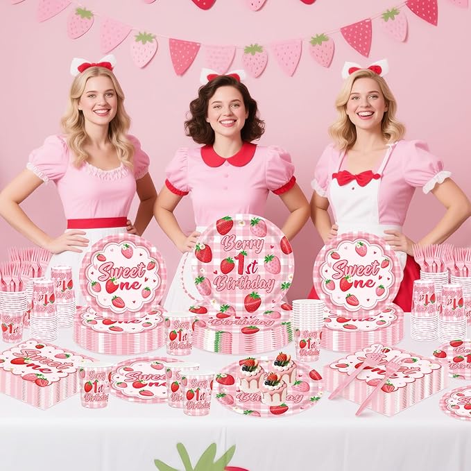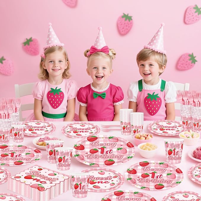 - Berry First Plates and Napkins-Serves 24: Our berry first birthday party supplies include 24*9inch plate, 24*7inch plate, 24*forks, 24*napkins, 24*cups, Each set can serve 24 guests, a great set for your strawberry party decorations.